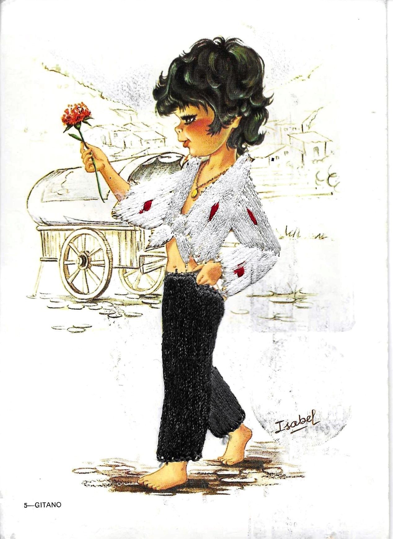 "gitano. Gipsy with a rose, by isabel" modern spanish embroidered postcardpublisher: cofiba distribuciones s.A.