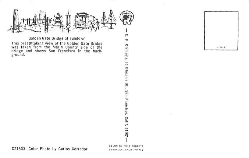 Golden Gate Bridge at sundown San Francisco California Postcard Grade: 1 Size: Regular Size Postcard - approximately 3 1/2 inch x 5 1/2 inch (9 CM x 14 CM) Grading Scale: Grade 1 = Perfect corners Grade 2 = Ver ... Read More
