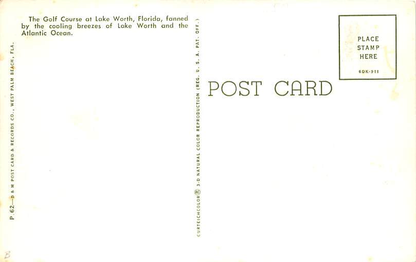 Golf Course Lake Worth FL Postcard - Unused Grade: 2 stains on back Size: R - Regular size: Approx 3 1/2 X 5 1/2 inch (9 cm X 14 cm) Grading Scale: Grade 1 = Perfect corners Grade 2 = Very Minimal corner wear, ... Read More