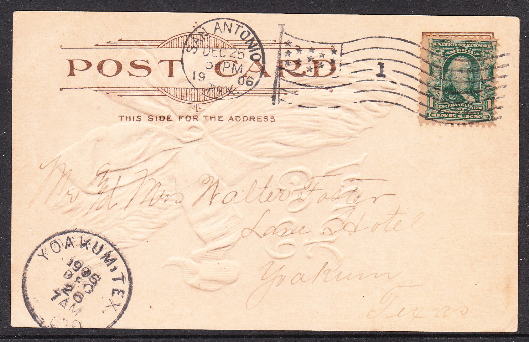 Please view jpegs for condition of edges and corners - everyone's idea of what is acceptable is a bit different. Serious defects not easily seen will be noted.//San Antonio flag cancel and nice Yoakum, TX receiver