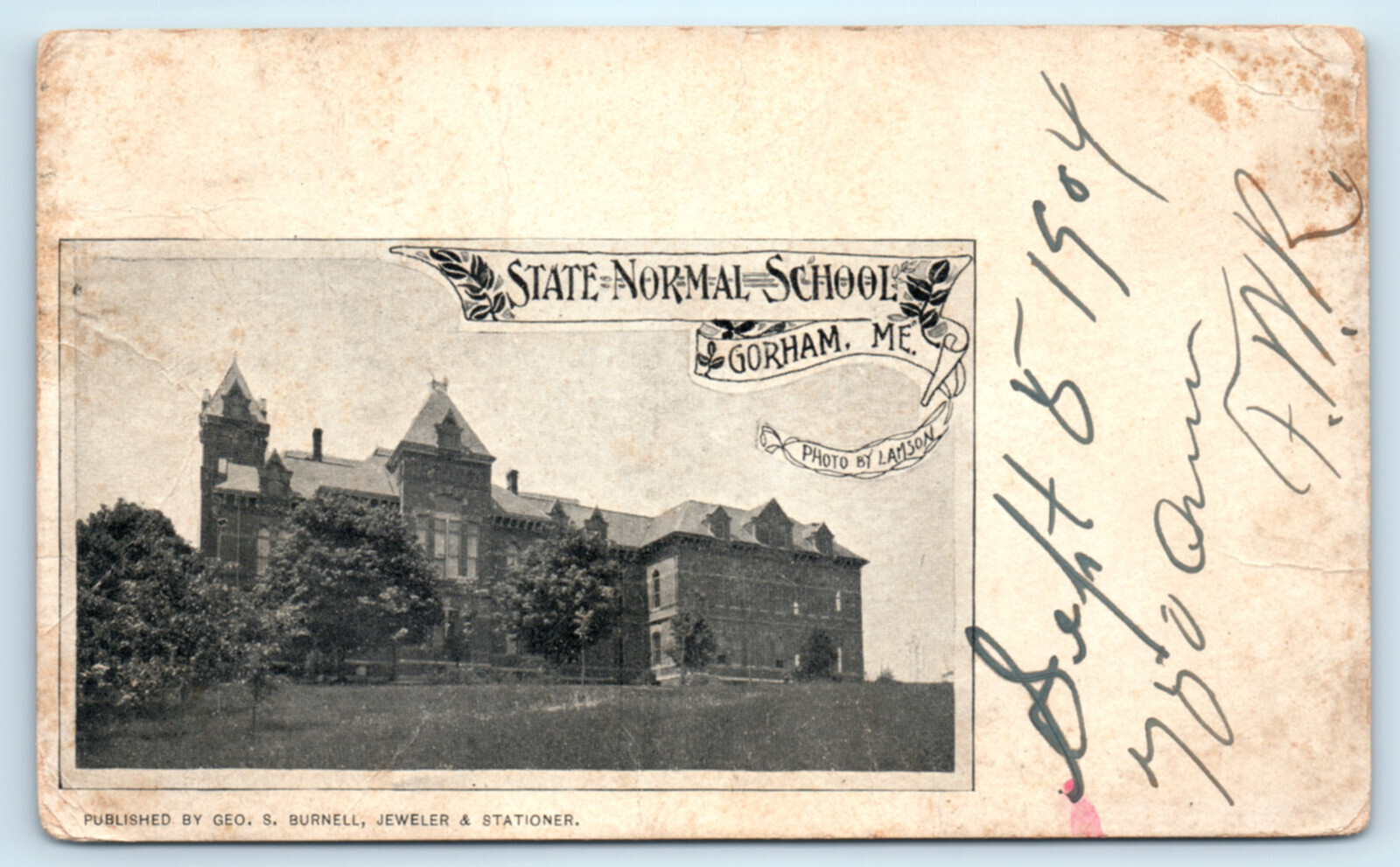 Gorham Maine State Normal School Building 1904 Postcard. Heavy wear creases and folds from postage and handling some soiling. 3.5 X 5.5 inches. Some wear from use age. See photos they are a key part of the item and condition description.Please ask us any questions you may have on this item prior to bidding or purchase we will get back to you asap. 1
