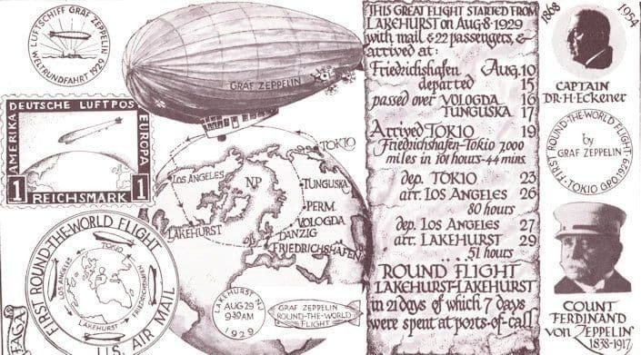 bg131x A stunning animated 1980s limited edition postcard celebrating the first Round The World Flight of the Graf Zeppelin with views of it shipping the USA post worldwide for the first time, a global map of its journey, a picture of the Captain of the ship and more - it is unused and mint