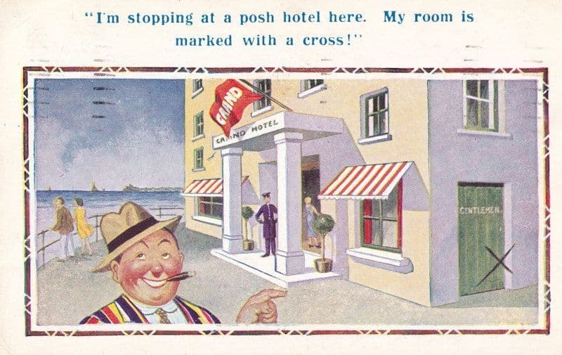 y32 Vintage comic postcard of arriving at a posh hotel in around 1940s graded vg minus to vg
