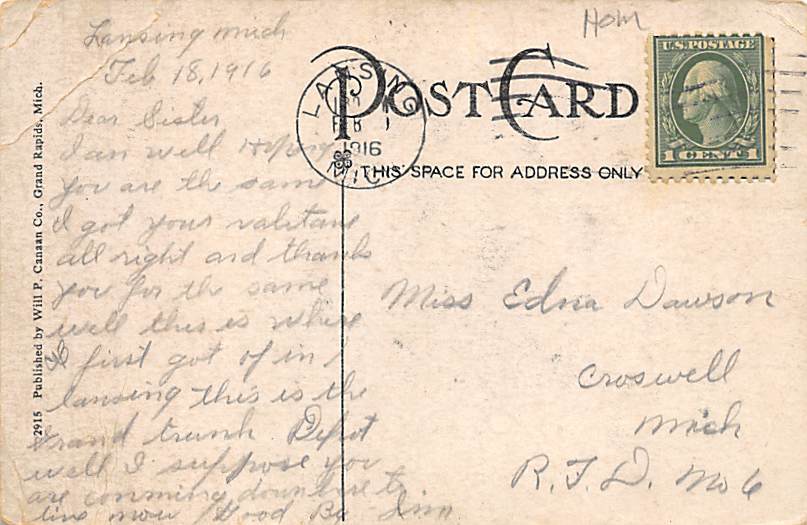 Grand Trunk Depot - Lansing, Michigan MI Postcard - View back side image Grade: 3 Size: R - Regular Size Postcard - approximately 3 1/2 inch x 5 1/2 inch (9 CM x 14 CM) Grading Scale: Grade 1 = Perfect corners ... Read More