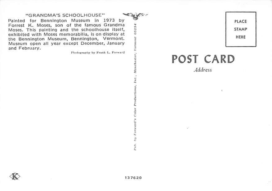 Grandma's Schoolhouse - Bennington Museum, Forest K Moses Grade: 1 Category: Continental Size Postcard, Approx 4 in x 6 in (10 cm x 15.25 cm) Product Size: Continental size: 4X6 inches (10.5 cm x 15 cm) Grading ... Read More
