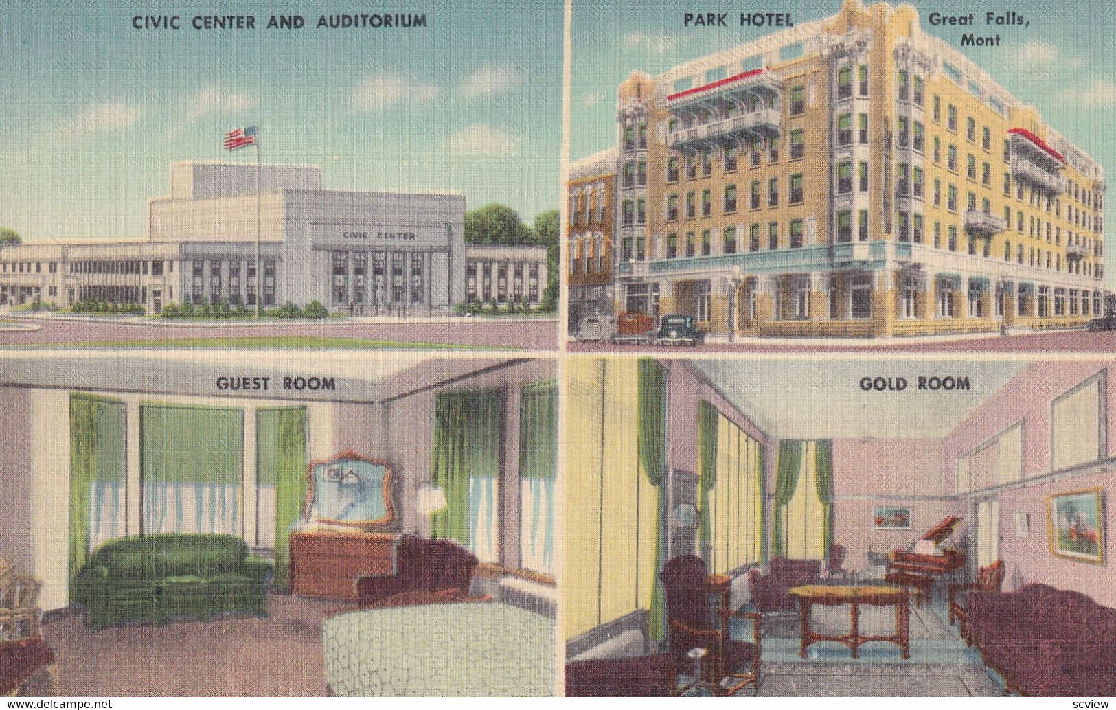 GREAT FALLS, Montana, 1930-1940's; Civic Center And Auditorium, Park Hotel, Gold Room, Guest Room :: Postcard, 3.5" by 5.5", Linen