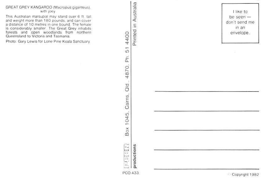 Great Grey Kangaroo - Australia Grade: 1 Category: Continental Size Postcard, Approx 4 in x 6 in (10 cm x 15.25 cm) Product Size: Continental size: 4X6 inches (10.5 cm x 15 cm) Grading Scale: Grade 1 = Perfect ... Read More
