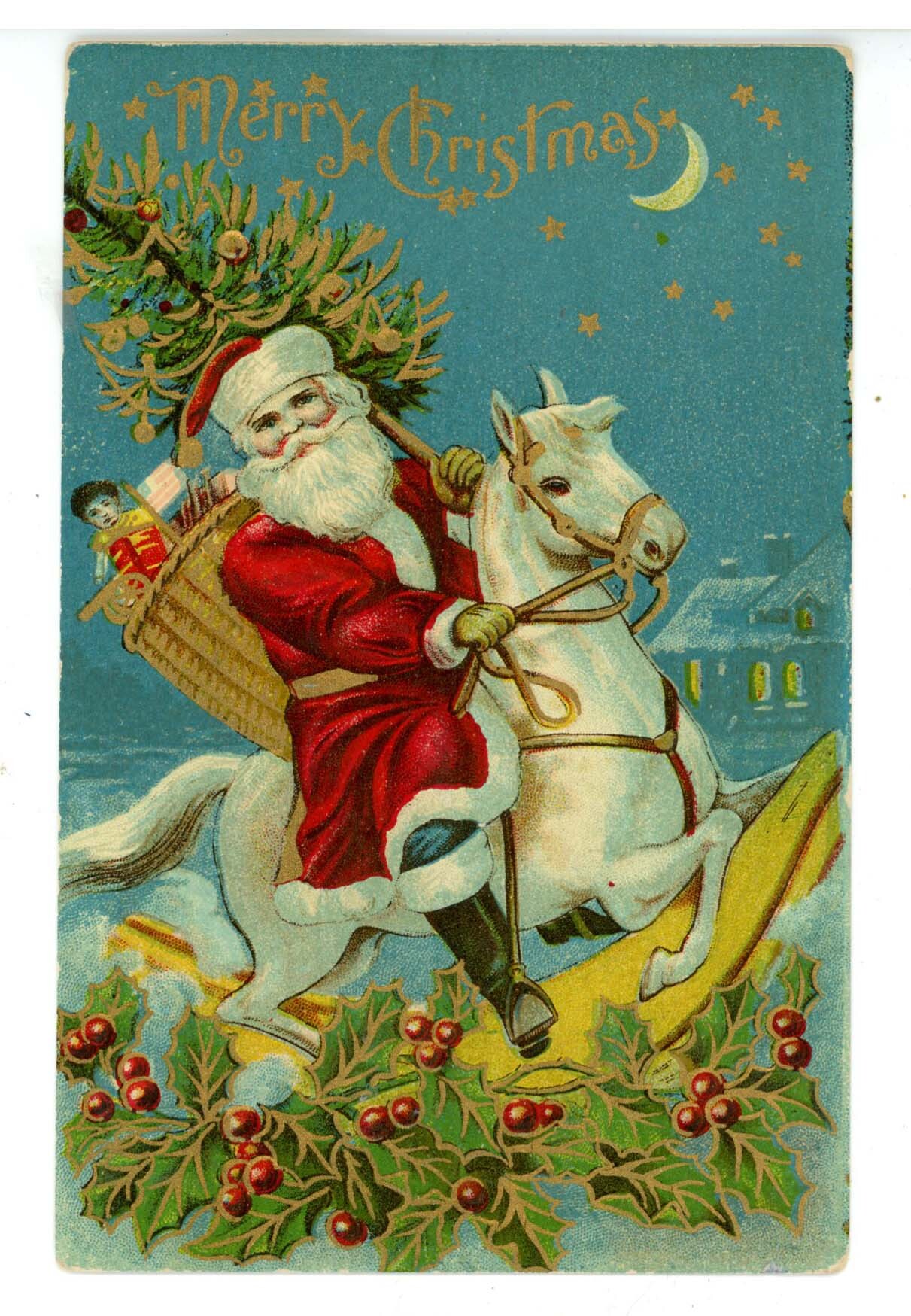 Greeting - Christmas. Santa Claus on Horse, Red Robe & Blue Pants ca 1908