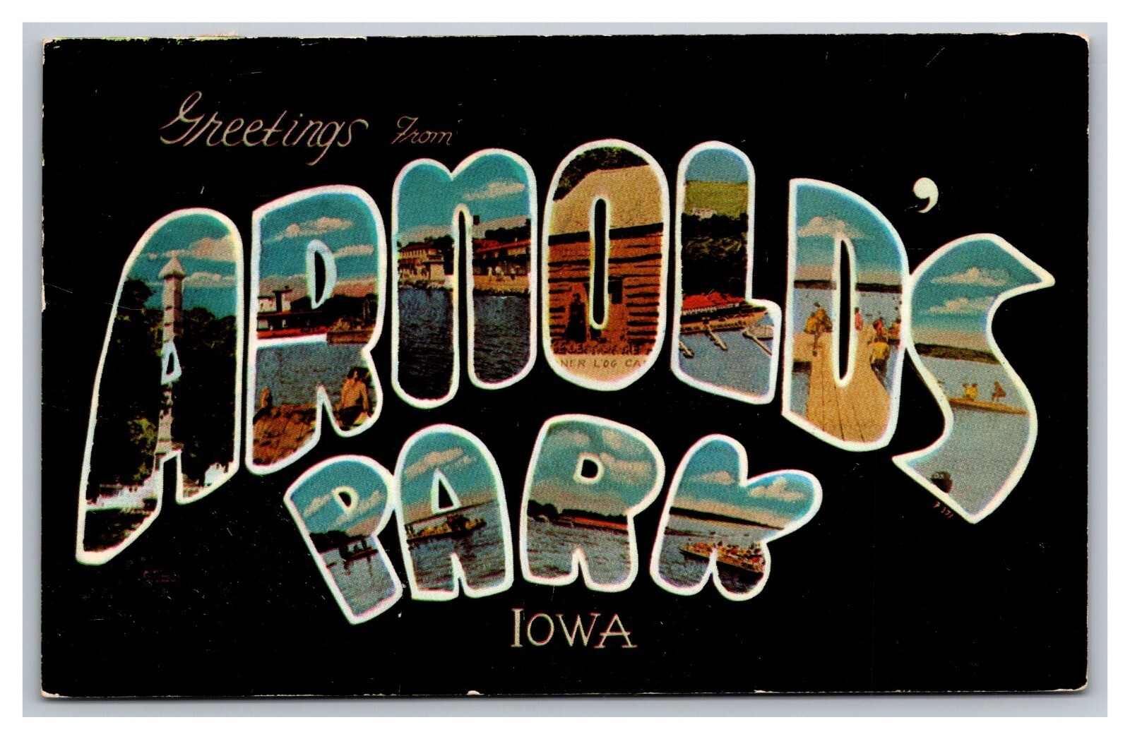 Condition: Mailed, Showing Wear From Handling. Writing On The Back. Reasonable Offers Always Considered. This postcard features a large letter design with a greeting from Arnold's Park in Iowa, dating back to 1962. ... Read More