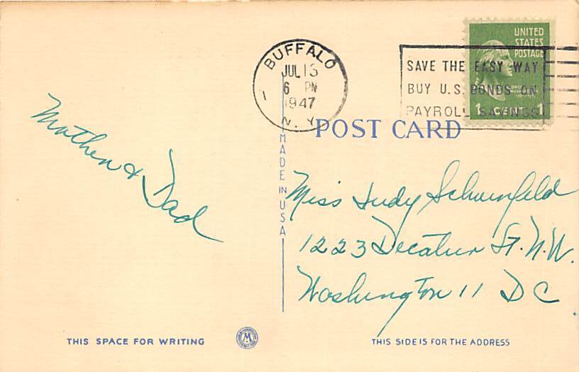 Greetings From Buffalo New York Postcard - 1946 Grade: 2 - light postal marking on front Size: R - Regular size: Approx 3 1/2 X 5 1/2 inch (9 cm X 14 cm) Grading Scale: Grade 1 = Perfect corners Grade 2 = Very ... Read More