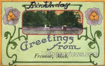 Greetings from in Fremont, Michigan Postcard - Unused Grade: 2 - writing on front edge Size: R - Regular size: Approx 3 1/2 X 5 1/2 inch (9 cm X 14 cm) Grading Scale: Grade 1 = Perfect corners Grade 2 = Very M ... Read More