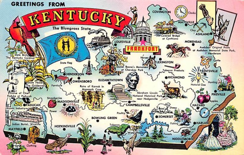 Greetings from Kentucky, USA Map Postcard Postal Date: Writing on Back Grade: 1 Size: Regular Size Postcard - approximately 3 1/2 inch x 5 1/2 inch (9 CM x 14 CM) Grading Scale: Grade 1 = Perfect corners Grad ... Read More