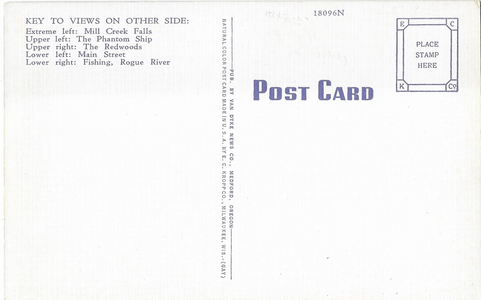 Greetings from MEDFORD Oregon, Mill Creek Falls, The Phantom Ship, Redwoods, Medford Main Street, Fishing on Rogue River