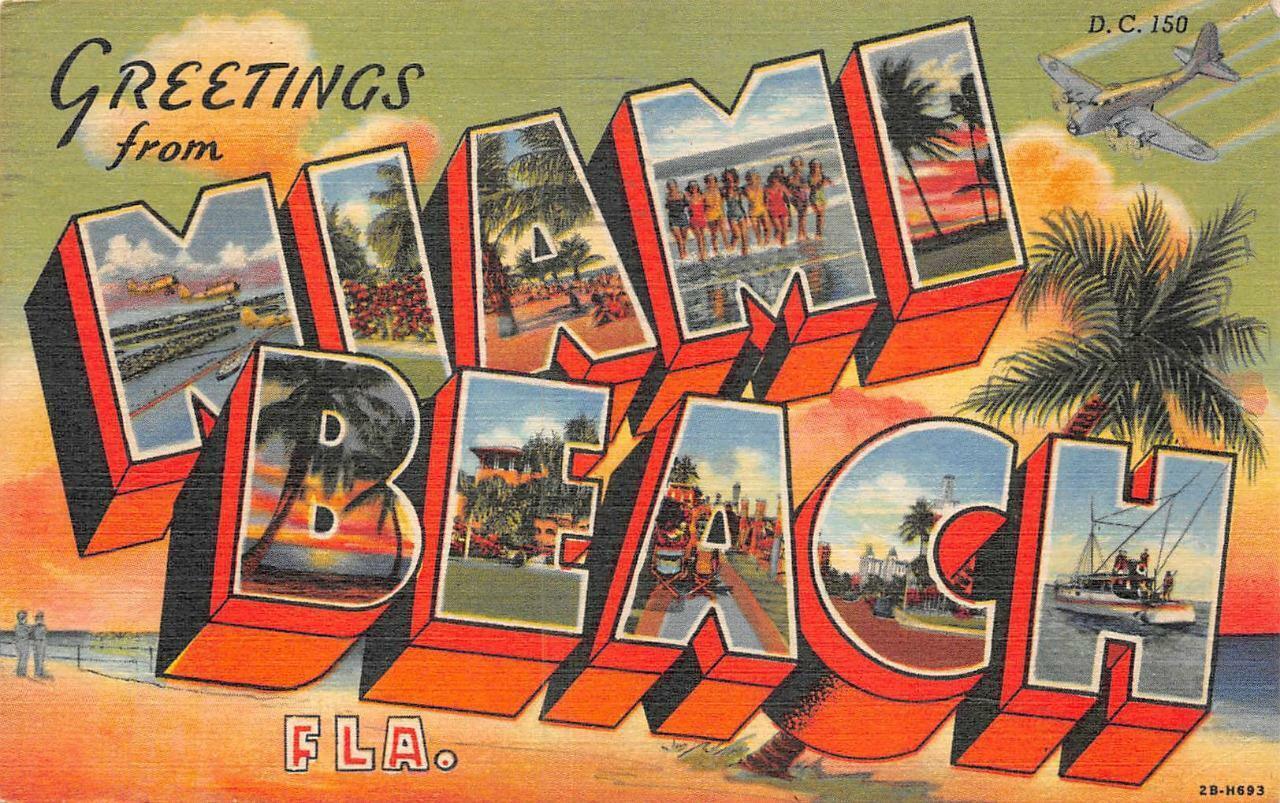 GREETINGS FROM MIAMI BEACH FLORIDA LARGE LETTER POSTCARD 1957
