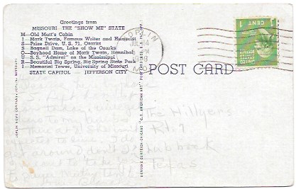 Greetings from Missouri. Nice card, postmarked July 1948. Sent from Joplin, Missouri, to Lubbock, Texas. Super nice Washington # 804. This card even has a code on the back telling what pictures are in each letter on the front. That's nice :)Seller Information