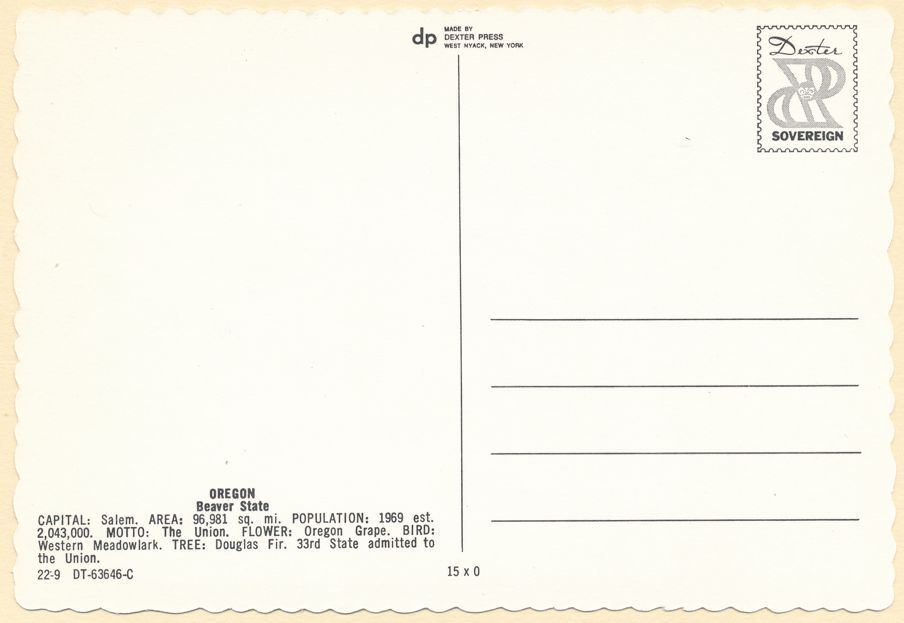 Greetings from Oregon - Map - State Bird Western Meadowlark. Continental sized chrome card. Excellent condition. Card edges are scalloped.