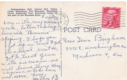 Greetings from Pennsylvania. Nice card, postmarked November 1955. Sent from Upper Darby, Pennsylvania, to Madison, Wisconsin. Super nice Jefferson coil # 1055.