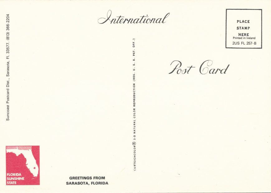 Greetings from Sarasota, Florida - Multiview. Sandy Beaches and Sunset. Continental sized chrome card. Published by Curt-Teich. Excellent condition.