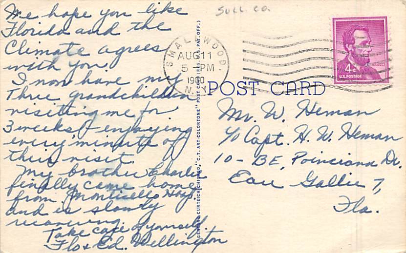 Greetings From Smallwood, New York NY Postcards - 1960 Grade: 4 Size: R - Regular Size Postcard - approximately 3 1/2 inch x 5 1/2 inch (9 CM x 14 CM) Grading Scale: Grade 1 = Perfect corners Grade 2 = Very Min ... Read More