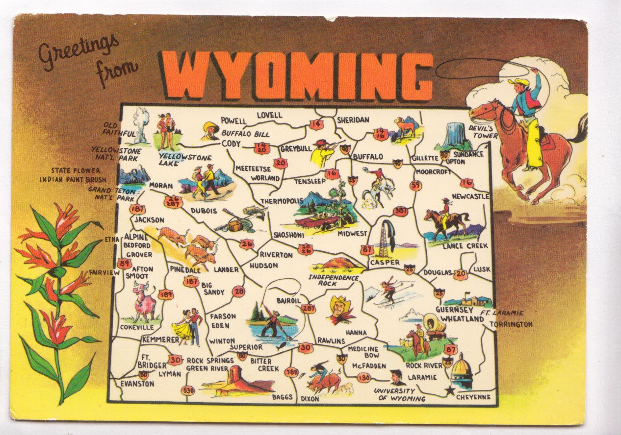 22595 Greetings from WYOMING, unused Postcard Condition: very good, corners & edges slightly worn and creased.