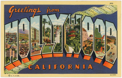 Greetings - Hollywood CA - Large Letter Linen c. 1936