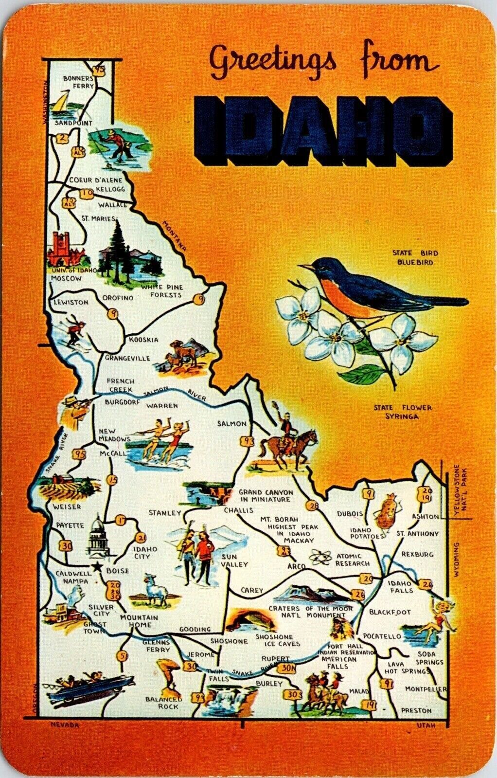Greetings idaho state map blue bird syringa flower cities db postcard