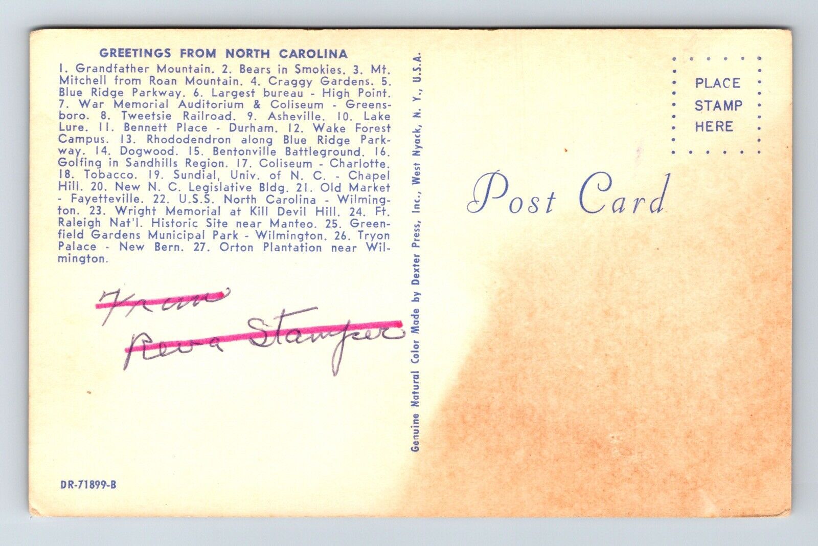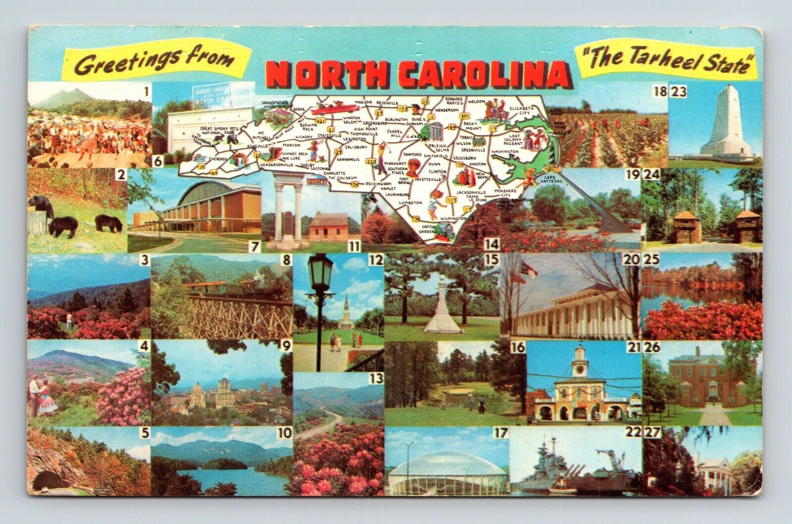 Greetings North Carolina Tarheel State Map Multi View Landmarks Chrome Postcard
