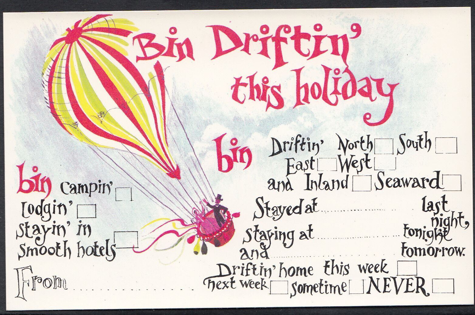 Greetings Postcard - Holiday Message Card - Balloon - Bin Drifting Away 1772