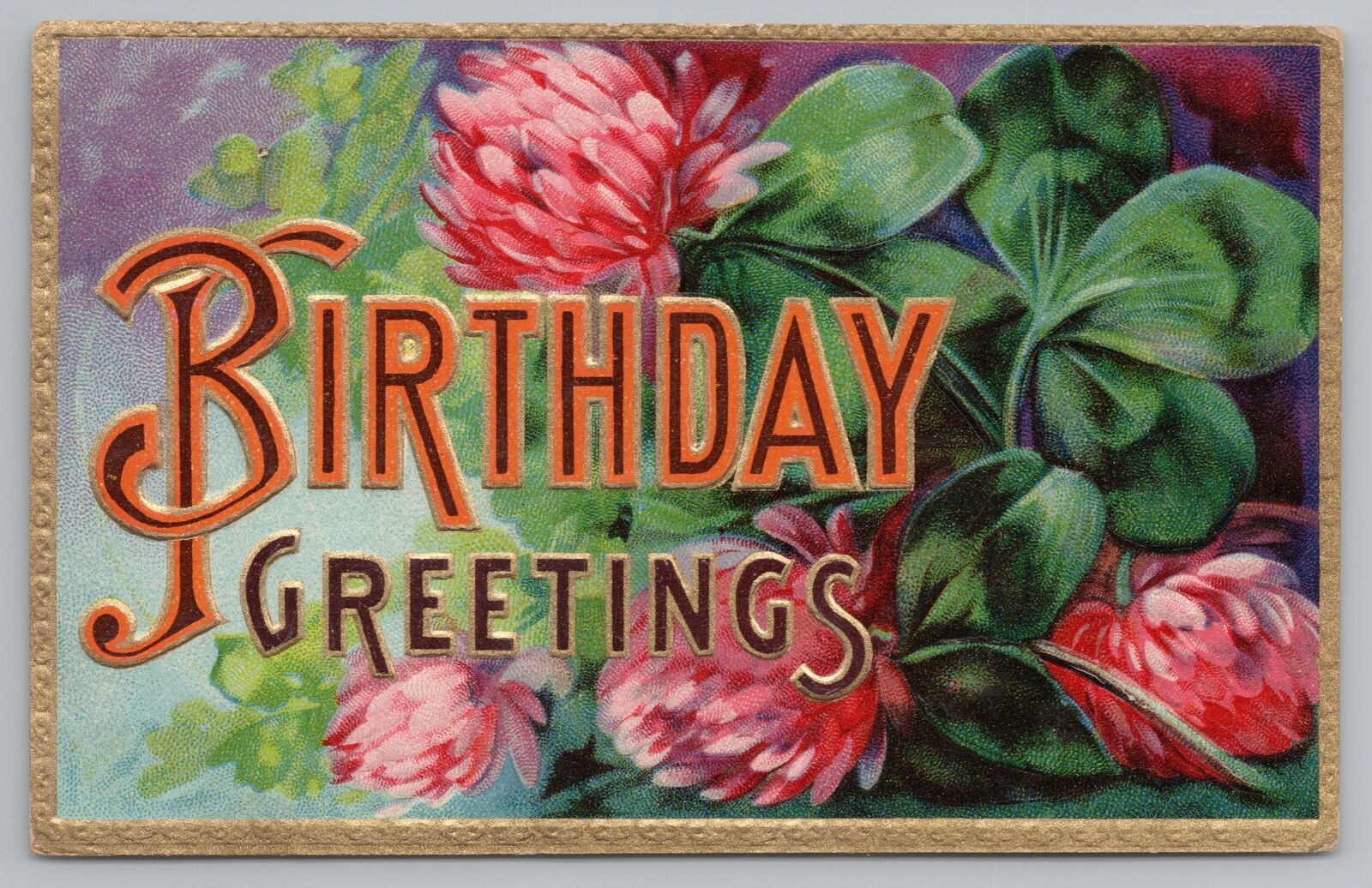 Greetings~Clovers & Blooms~Birthday~Vintage Postcard