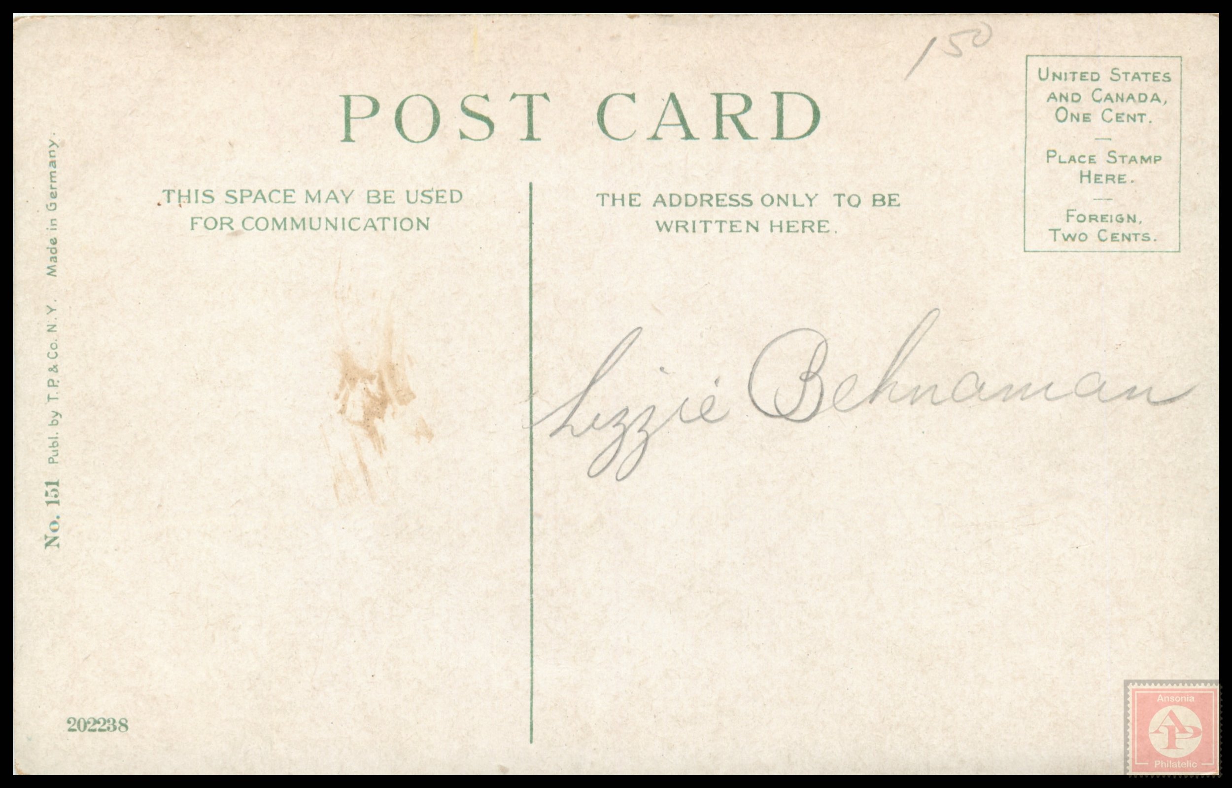 Some scans of postcards result in colored streaks which are a result of the error in scanning and not a fault of the postcard.