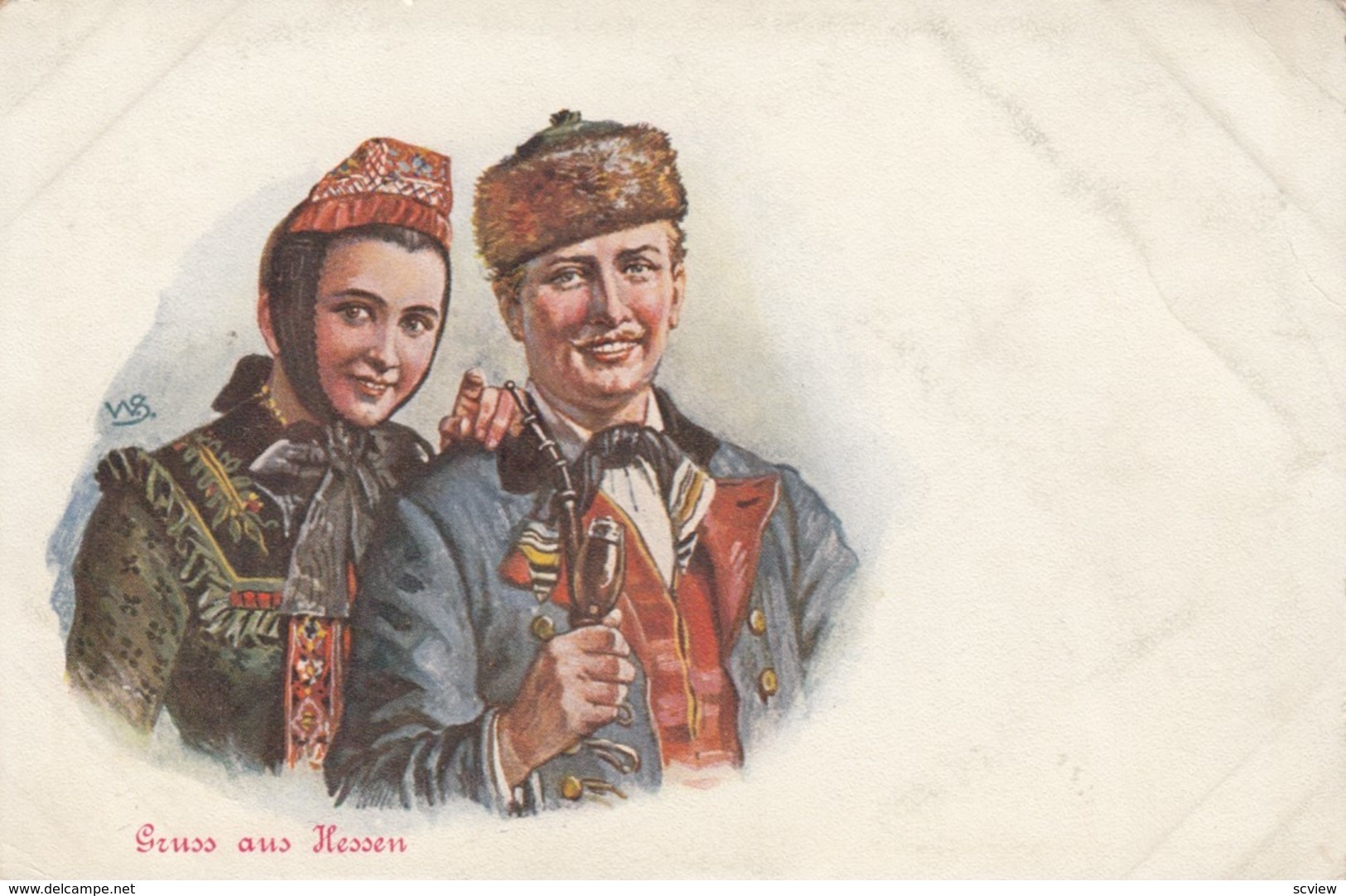 Gruss aus Hessen , Germany , 1890s ; Couple :: Postcard , 3.5 by 5.5" , Litho
