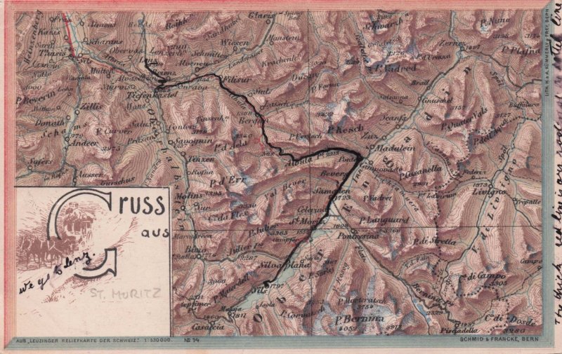 zx153 Antique 1901 postcard of Gruss Aus with St Moritz being identified by the owner and it seems he has marked the route he talk in his travels in Switzerland some 120 years ago - it is great used condition but p ... Read More