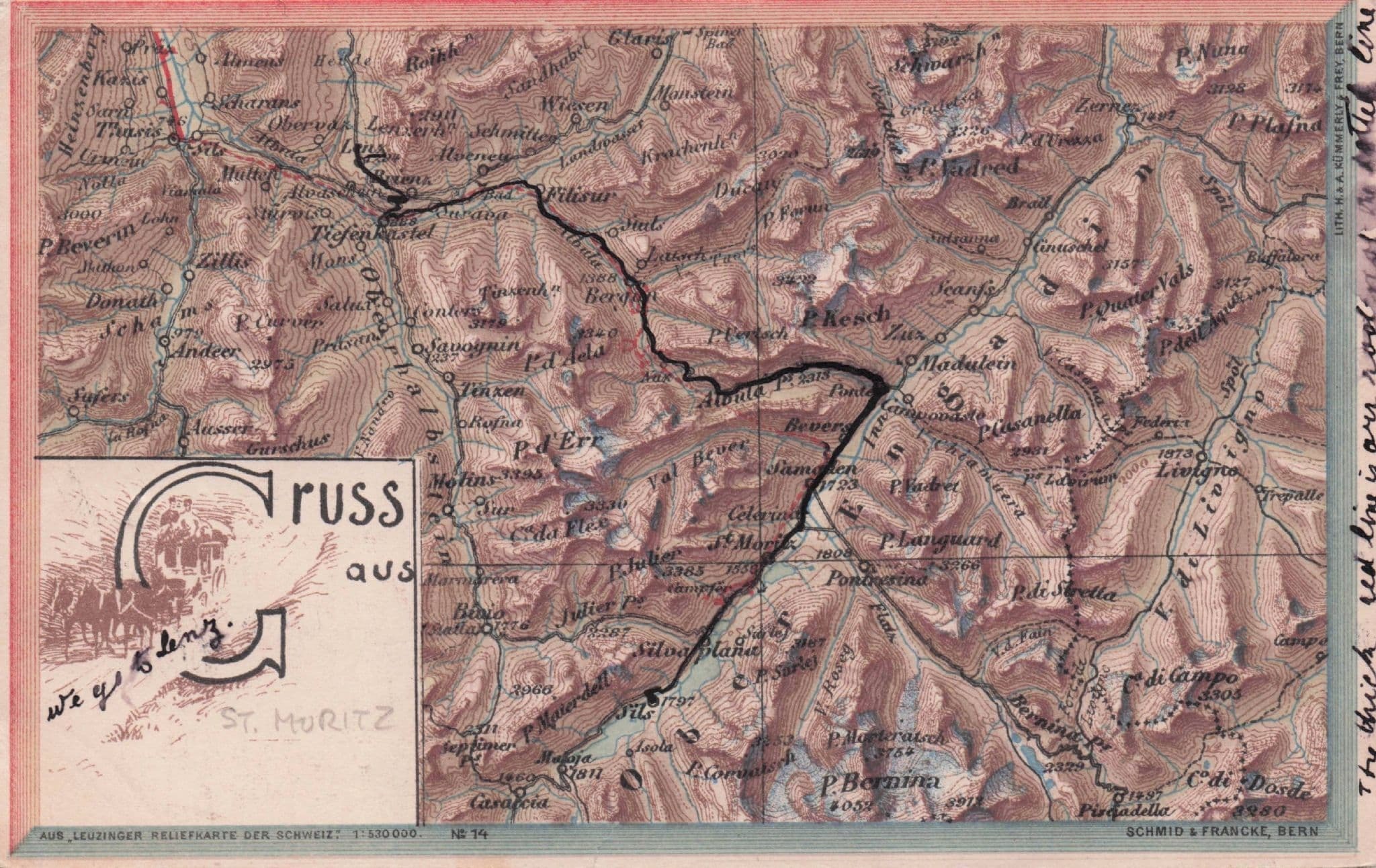 zx153 Antique 1901 postcard of Gruss Aus with St Moritz being identified by the owner and it seems he has marked the route he talk in his travels in Switzerland some 120 years ago - it is great used condition but please allow for owners route marking and side sentence note about his journey (see scan). 1901 frank on reverse (see image 2).