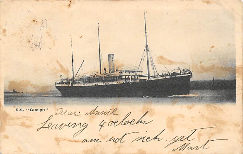 Guelph Union Castle Line Postcard Writing on back, Grade: 3 - yellowing from age, , Size: Regular Size Postcard - approximately 3 1/2 inch x 5 1/2 inch (9 CM x 14 CM) Grading Scale: Grade 1 = Perfect corners Gr ... Read More