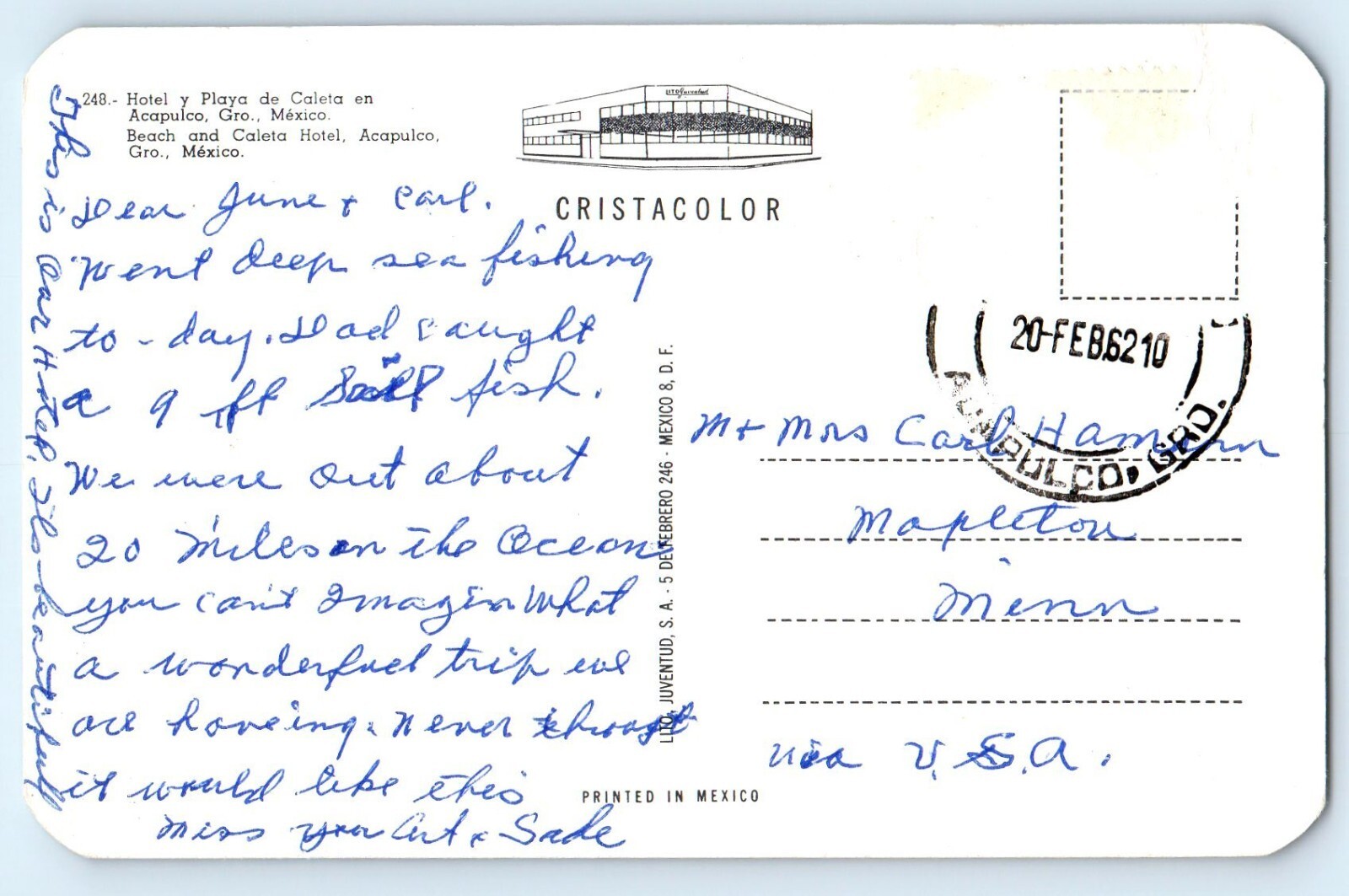 Guerrero Mexico Postcard Beach and Caleta Hotel Acapulco 1962 Vintage