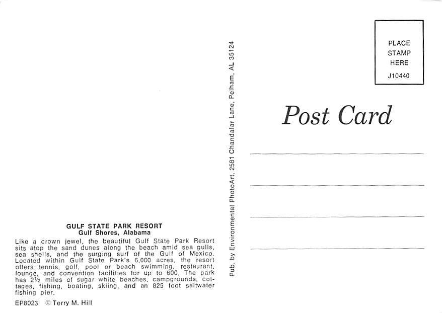 Gulf State Park Resort Alabama Grade: 2 Size: Continental Size - approximatly 4 Inch x 6 Inch (15 cm x 10.5) Grading Scale: Grade 1 = Perfect corners Grade 2 = Very Minimal corner wear, no creases Grade 3 = So ... Read More