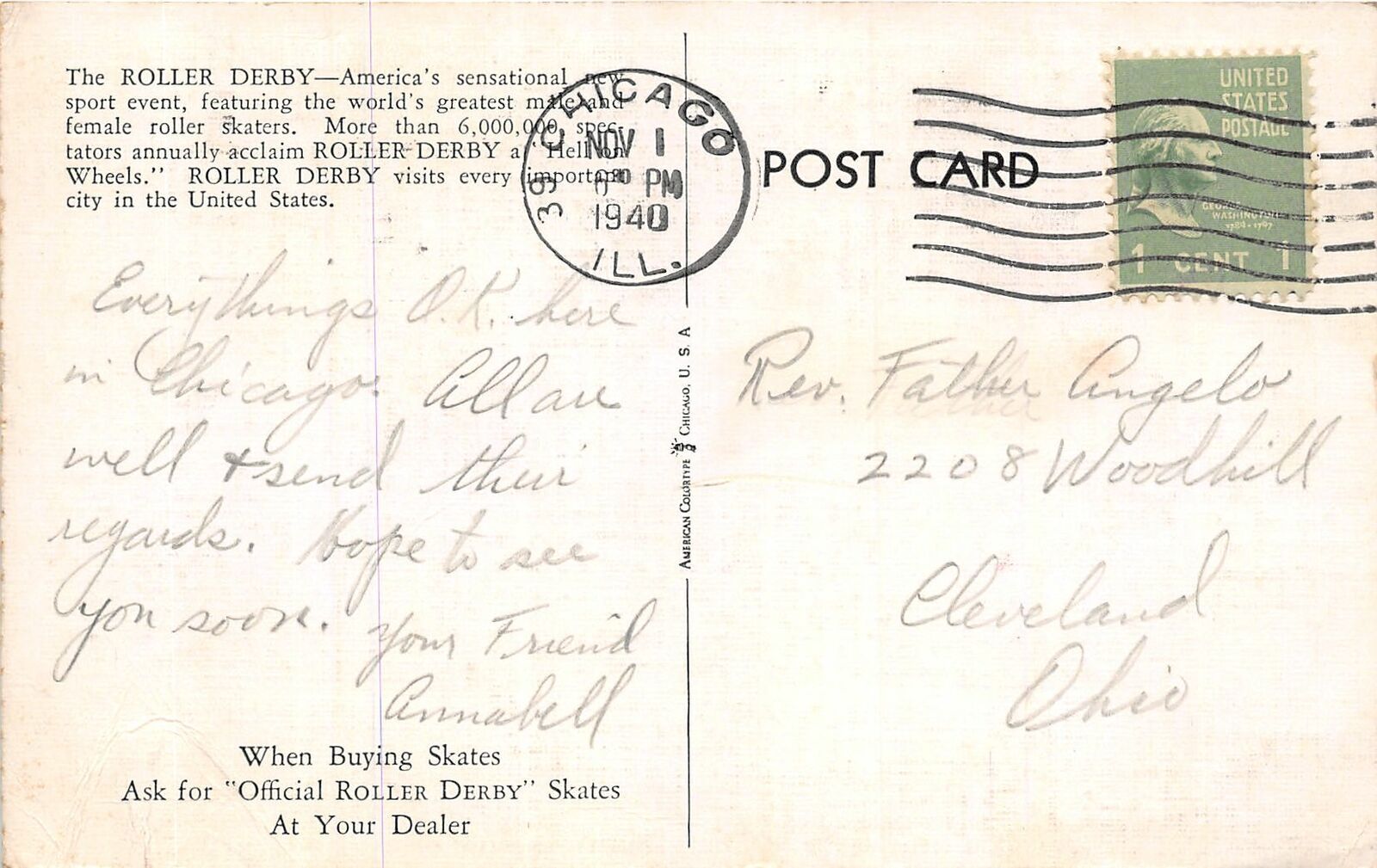 H76/ Chicago Illinois Postcard c1940 Roller Derby Roller Skates Wes Aronson 92