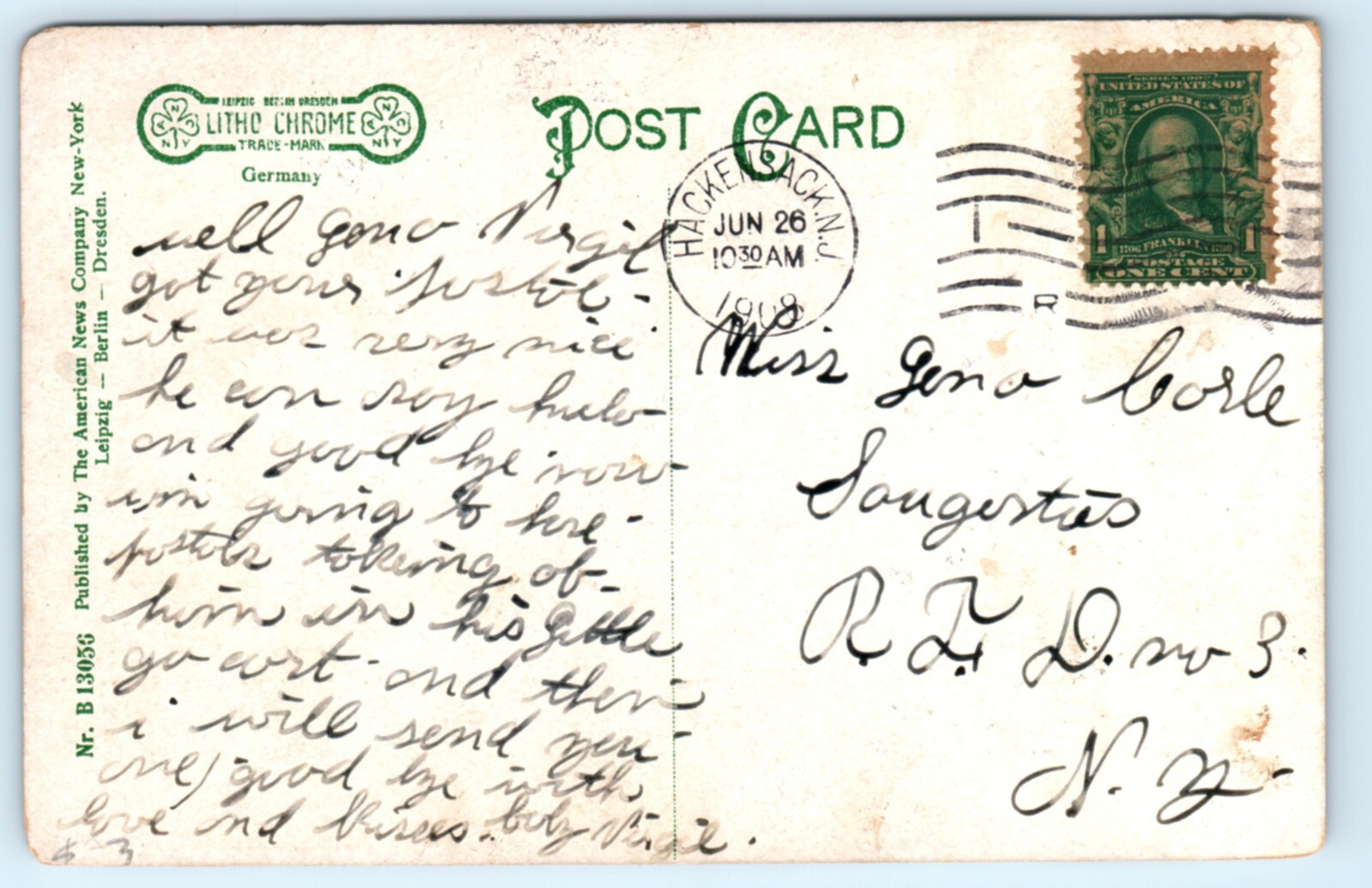 Condition: The first main image is zoomed in to show detail. This is a used printed postcard measuring ... Read more about the seller notes The first main image is zoomed in to show detail. This is a used printed postcard measuring approximately 5.5 x 3.5 inches. It shows signs of age and handling, including folds, creases, cracks, chips, scratches, corner bumping, edge wear, and discoloration. Wear from use, storage, transport, and age. The postcard may also have ink or pencil writing, as well as postal ink from cancellation marks. We encourage you to carefully review the provided color scans/photos, as they are an important part of the item's condition description. If you have any questions before bidding or purchasing, feel free to reach out and we’ll respond as soon as possible. Read Less about the seller notes