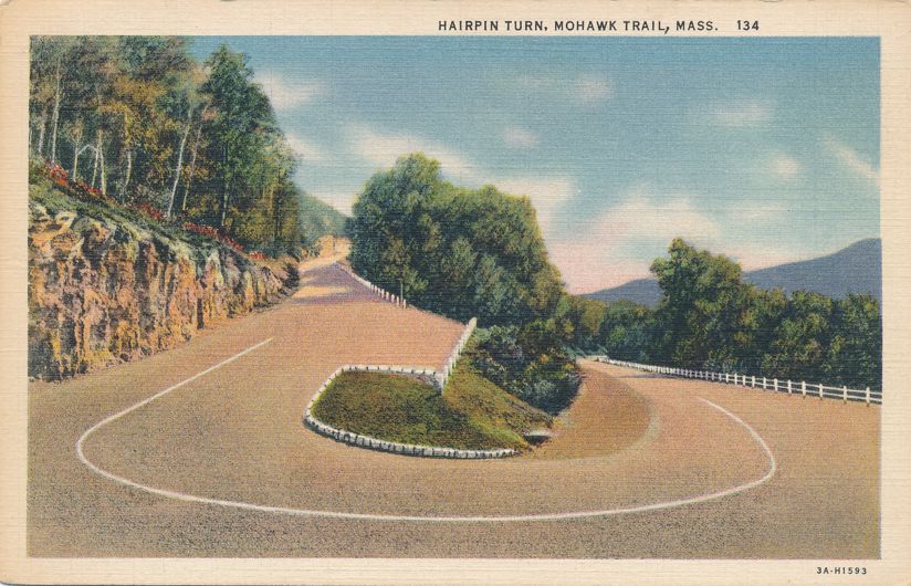 Hairpin Turn on the Mohawk Trail - Massachusetts. Standard sized linen post card. The Curt-Teich Dating Guide assigns 3A-H1593 to 1933. Very good condition.