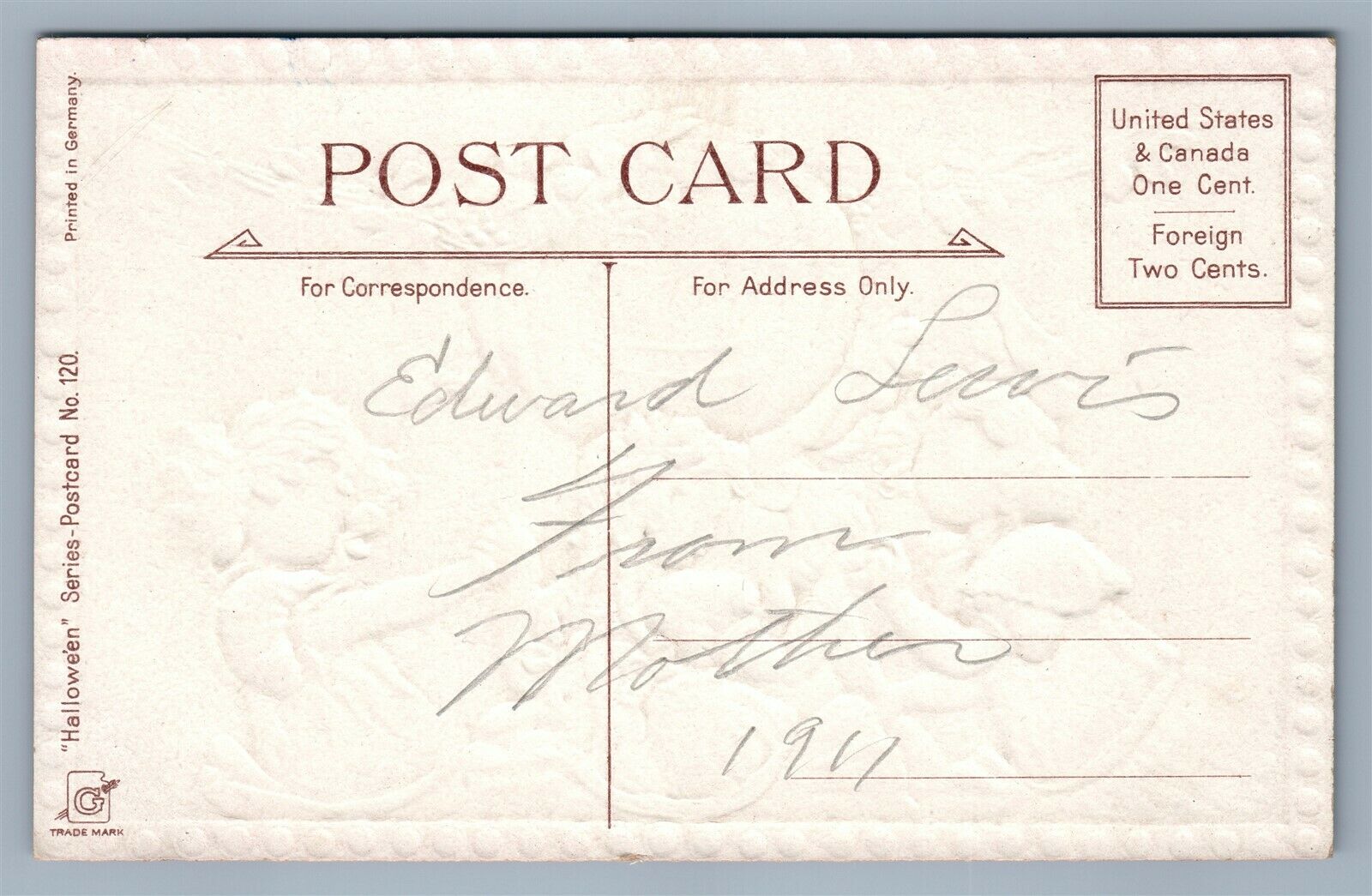 HALLOWEEN ANTIQUE EMBOSSED POSTCARD by FRANCES BRUNDAGE