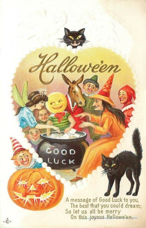 Embossed Early Printed Postcard Halloween, Black Cat Owl, Witch, Characters, Stecher No. 216 E Postmark: None Image: Nice and clean Corners: Light wear Faults/Other: