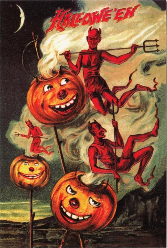A modern postcard reproducing an antique Halloween postcard from the 1910s. It shows three devils flying beside steaming jack-o-lanterns on sticks over a bleak landscape.