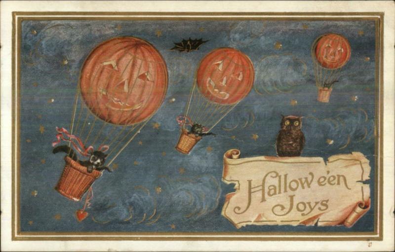 Halloween JOL Pumpkin Head Hot Air Balloons c1910 Postcard