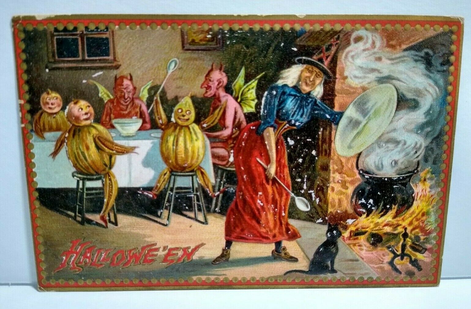 Halloween Postcard Tucks Original Devils & Gourds Dining Witch Brewing No 160