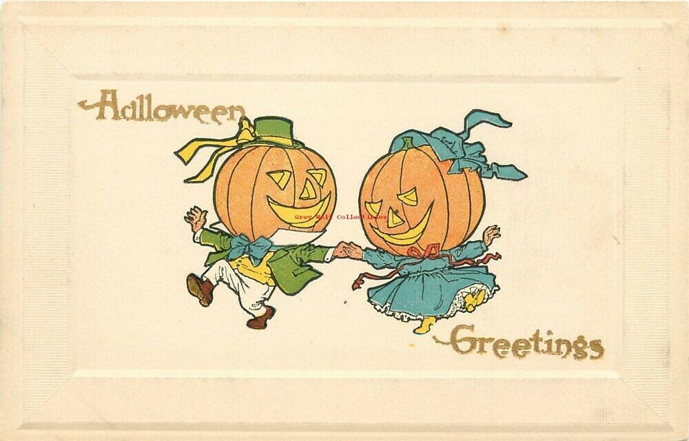 Embossed, Early Printed Postcard Halloween, Two Pumpkin Heads Dancing Publisher/Printer: Gibson Art Postmark: None Image: Nice with some light soiling on right Corners: Light wear Faults/Other: