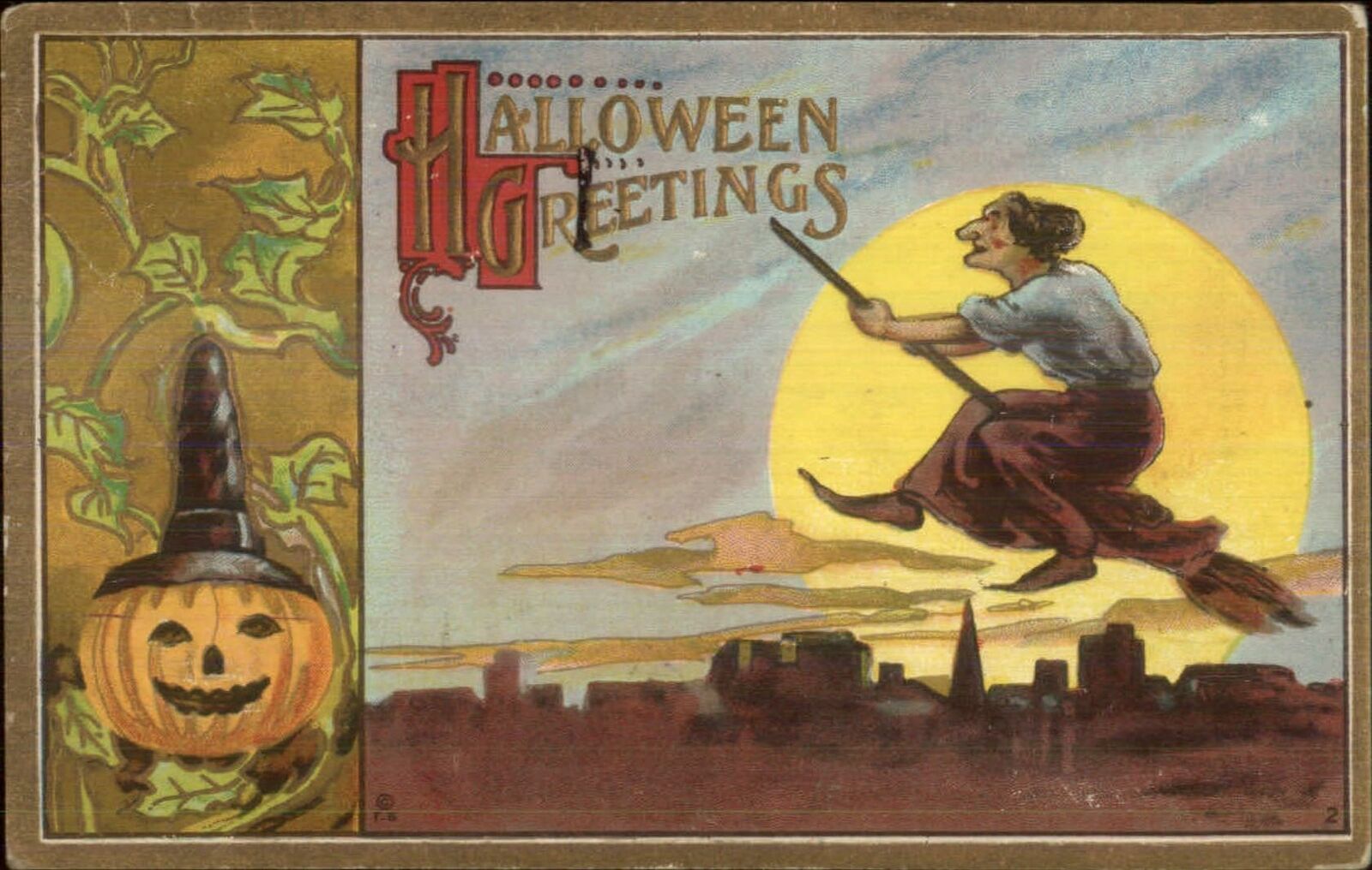 Halloween - Witch on Broom Moonlight #2 c1910 Postcard