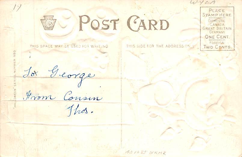 Halloween Postcard writing on back, Grade: 4, , Size: Regular Size Postcard - approximately 3 1/2 inch x 5 1/2 inch (9 CM x 14 CM) Grading Scale: Grade 1 = Perfect corners Grade 2 = Very Minimal corner wear, no ... Read More