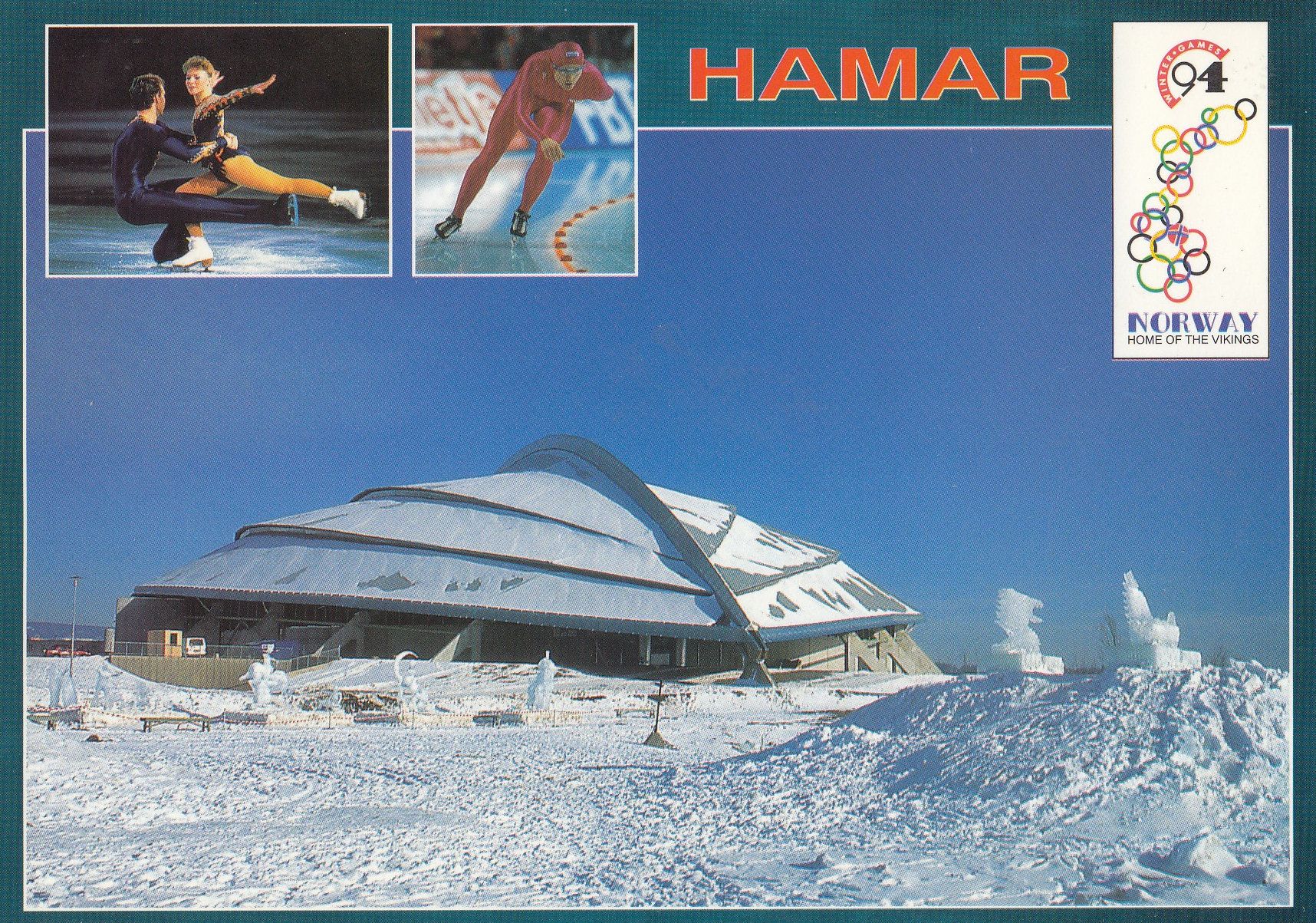 975 A rare 1980s postcard from Hamar showing the Norwegian Ice Skating Rink which host the Olympic Games Arena also known as the Viking Ship unused and mint