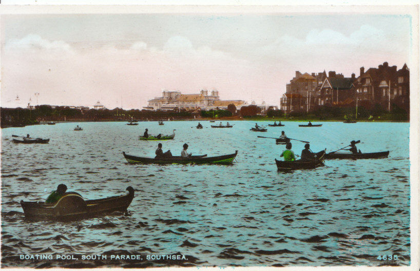Postcard description: hampshire postcard - boating pool - south parade - southsea - real photograph - showing south parade pier in background