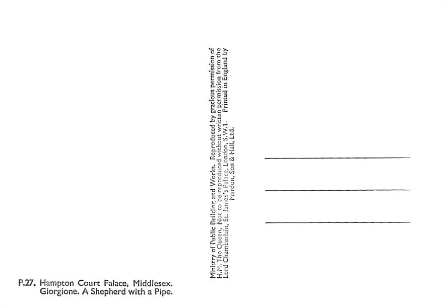 Hampton Court Palace - Middlesex Grade: 2 Category: Continental Size Postcard, Approx 4 in x 6 in (10 cm x 15.25 cm) Product Size: Continental size: 4X6 inches (10.5 cm x 15 cm) Grading Scale: Grade 1 = Perfec ... Read More